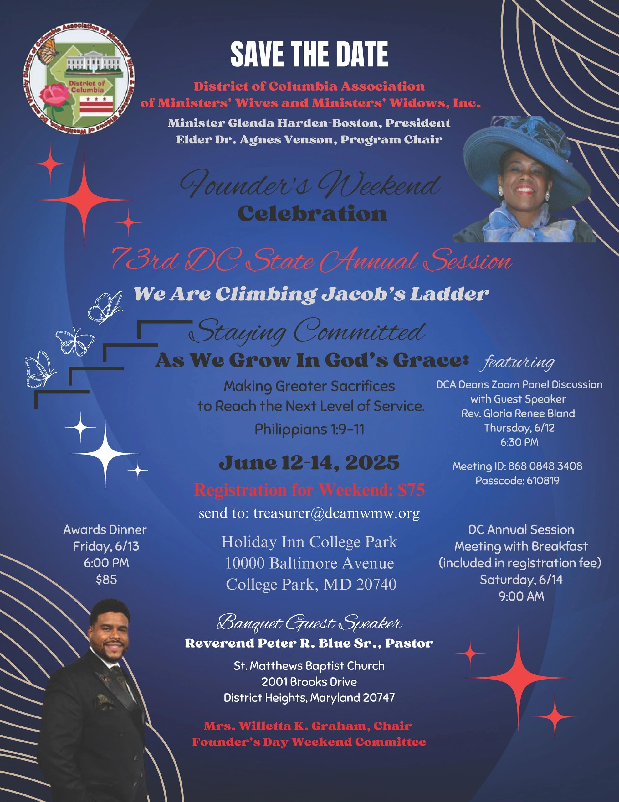 We will begin the celebration weekend with a zoom panel discussion with the three Deans of the DCAMWMW Education Department on “Growing in God’s Grace” featuring guest speaker, Reverend Gloria Renee Bland. Each dean will have their own topic to discuss, and the guest speaker will close-out with the Word.